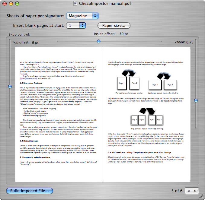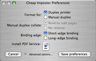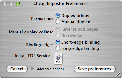 Cheap Impostor was a CreativeTechs QuickTip Screenshot of Version 3:Preferences: User comments A K M Adam says "...Cheap Impostor, my favorite among page-imposition programs, has at last released a version that resolves the two-up PDF problem for printed matter that doesn’t need imposition..." Thanks AKMAdam! "GREAT PROGRAM!! I've been making minicomics for years now, doing the imposition in quark.. this is so much easier.. it's really a well done program. THANK YOU!" -- Jordan, Los Angeles, CA "This is really great. We took delivery on the color laser last week expecting to be able to just directly run our stuff and it was a bad moment when I discovered we had to figure out this other step. Thanks for offering this program." -- Rev. Jim Eaton, Norwich CT You're welcome! The inspiration to write Cheap Impostor was when I bought a Minolta 2350 Color Laser, and had exactly the same challenge. "thank you for your application, it's really nice, simple (mostly) and self-explaining. and the readme is kinda funny as well" -- Kai from the Netherlands Thanks! I think the readme is kinda funny too. System requirements: MacOS X 10.5 - 26 for version 3.4.MacOS X 10.4 for Version 3.1. MacOS X 10.3.9 or greater for version 2. Memory is always good. |
