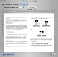 If you want to use your computer to make a book or a magazine, the final step before printing is called imposition. Cheap Impostor is a simple yet powerful alternative to fancy imposition software. It doesn't offer all the features of high-end imposition software (which costs hundreds or thousands of dollars). Hence the name. However, if you want to print and bind booklets, magazines, or even long books, this program might be all the imposition software you need. What does it do?Let's say you want to make a magazine from a document you've written. You would like to have the magazine be the size of a sheet of paper folded in half. You might assume that you can simply print the document 2-up, fold it in the middle, staple and be done. Whoops! If you did that, the first page would be on the back cover of your "magazine", while page 2 would be on the front. And so on...it gets really ugly. Sooo: Without imposition software the simplest way to transform your document into a magazine would be to use a photo-copier to shrink the pages so two fit sideways on a sheet of paper, and reorder them so that when a stack of them is stapled and folded in half the pages appear in the correct order. The short story is that Cheap Impostor lets you skip the photocopier step, and produce output from your printer that can directly be turned into a magazine. Further, Cheap Impostor has settings that let you create books with multiple signatures. Tutorial: Binding books with Cheap Impostor This is a description of how I used Cheap Impostor to print and bind a book. Blog posting: Rick DeNatale posted a very nice blog post about using Cheap Impostor to make books. I like his press more than mine - I think I'll be building one like it.