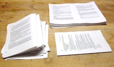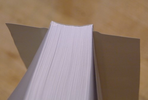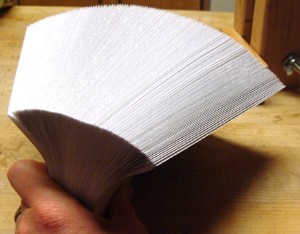 TroubleshootingIt didn't come up in this document, but the most common problem people have when using Cheap Impostor is that it doesn't respect cropping or page insertion operations or other esoteric PDF alterations. The solution is to open the file in "Preview" (not Acrobat Reader) and Print, then "Save as PDF..." - the file produced by this method is cleaned up and ready for Cheap Impostor.FoldingThis is the most time-consuming step (for most books), but it's also the one that there is the least to say about. Your goal in this step is to turn the pile of pages that came out of the printer into the pile of folded pages you see on the right. |