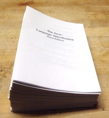 Fortunately for me (and for Cheap Impostor), Sun's official Java Language Specification is available as a free PDF file, with license given to each user to print one copy. Click here for a copy of your own. Using Cheap Impostor, I was able to turn Sun's PDF file into this book with about 2 hours effort (plus some waiting): |