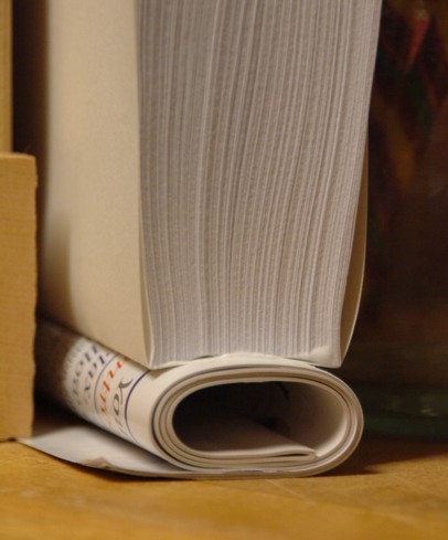 ![]() Here is the extra sheet of paper being glued to the binding. I like to let it dry while resting on some rolled-up junk mail - this helps the paper stay stuck to the binding. |