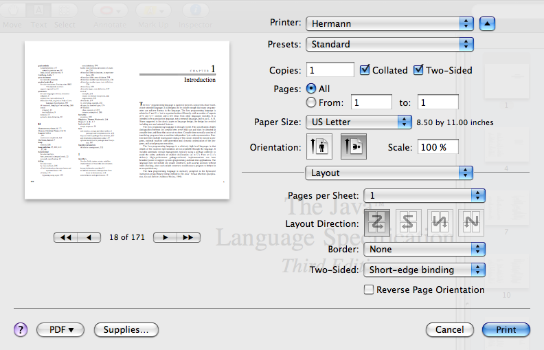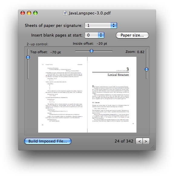 Tweaking zoom and offsetI often need to use negative offsets when imposing documents intended for full-sized letter paper. In this case, the top offset was -18pt, and the inside offset was -50pt. The zoom factor of 0.81 is what I spent most of my time adjusting in order to get the outside margin "just right" (about 0.25 inches). It turns out that for this book these settings are not perfect. The page numbers on chapter headings get a bit chopped off, but all-in-all, it's pretty good. Printing the document |